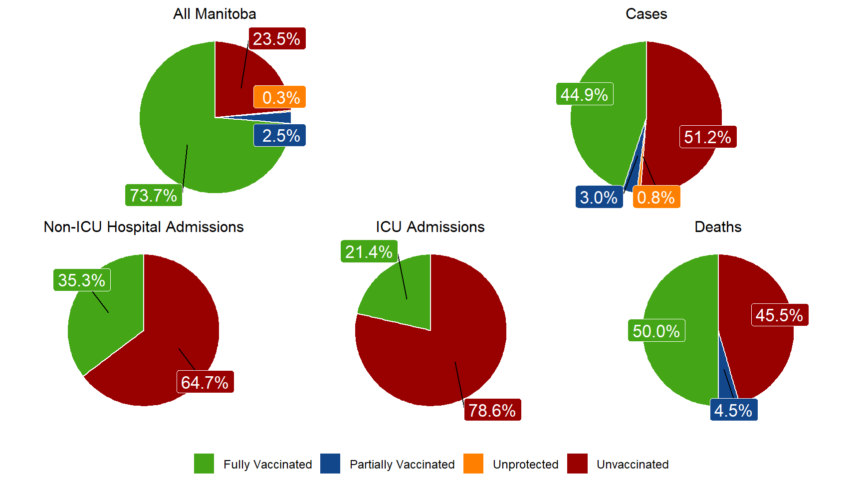 BackFigure 5. Vaccination Status in New Cases, non-ICU Hospital Admissions, ICU Admissions, and Deaths, Manitoba, November 21, 2021 – November 27, 2021