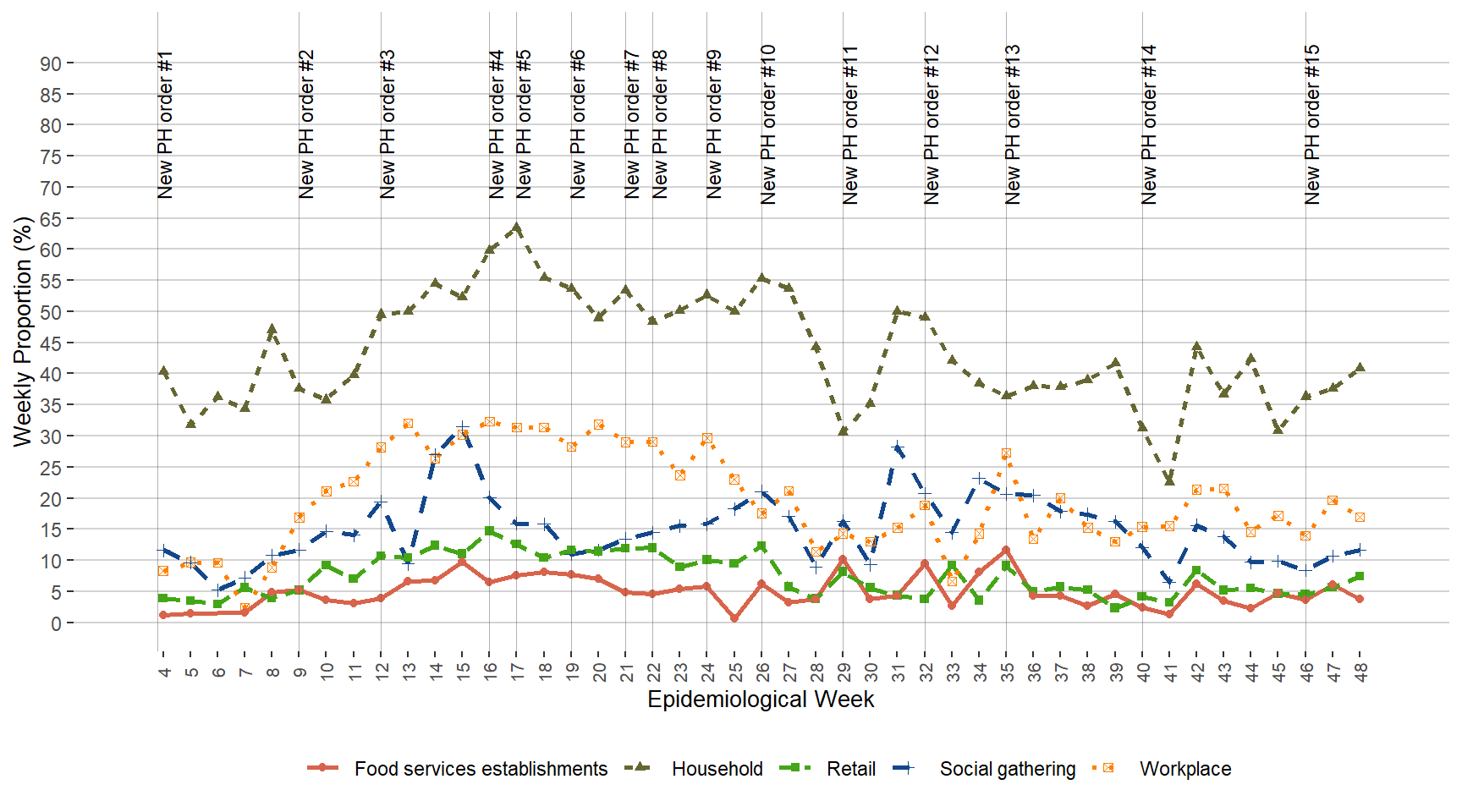 Figure 13. Percentage of Community-transmitted COVID-19 Cases Exposed to Top-five Acquisition Settings, Manitoba, January 24, 2021 – December 4, 2021