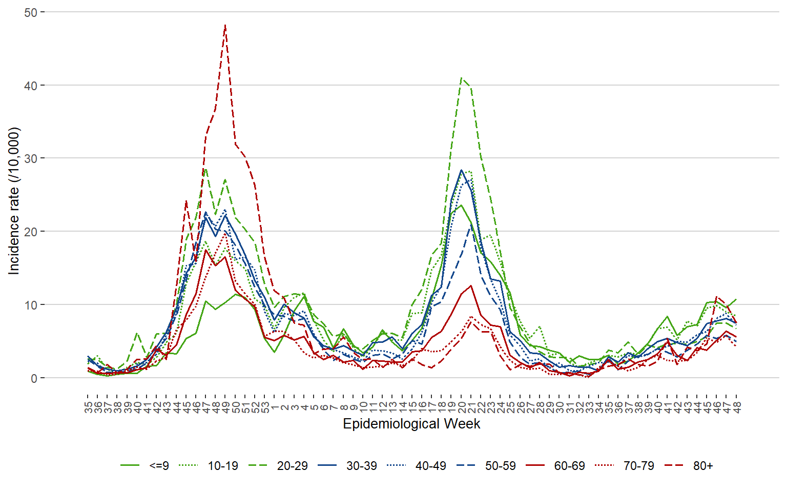 Figure 3. Incidence Rate (/10,000 Population) of COVID-19 Cases by Age Group and Week of Public Health Report Date, Manitoba, August 23, 2020 – December 4, 2021