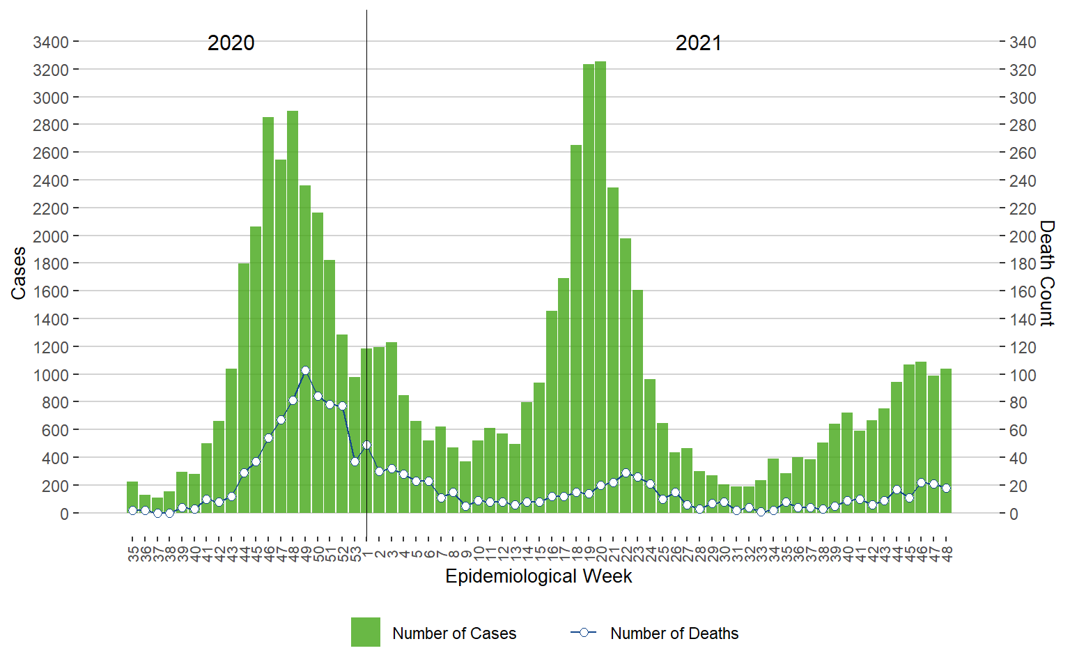 Figure 1. Cases of COVID-19 by Week of Public Health Report Date, Manitoba, August 23, 2020 – December 4, 2021