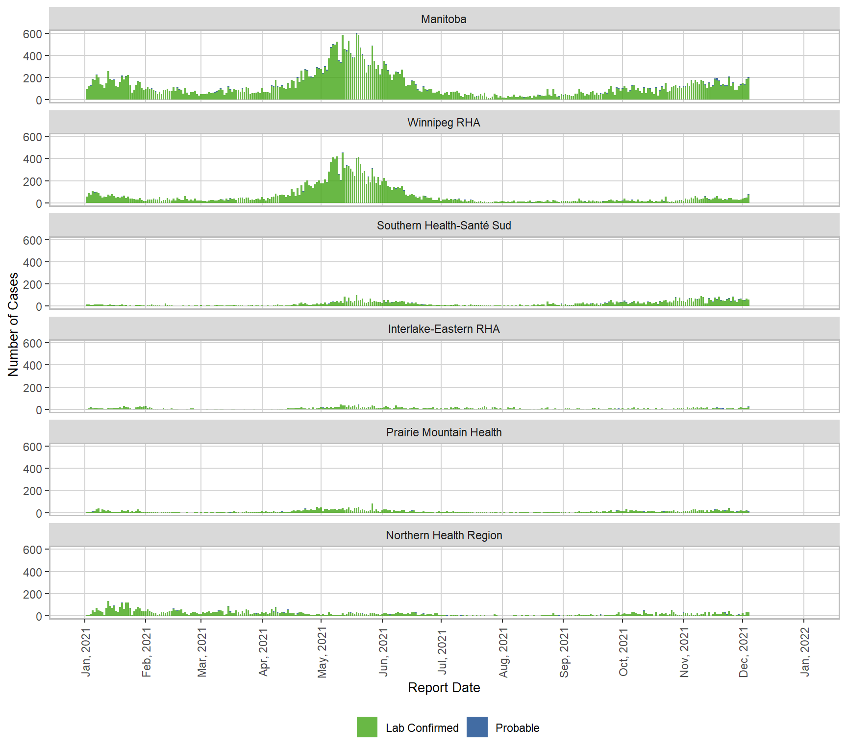 Figure 4. Cases of COVID-19 by Health Region and Public Health Report Date, Manitoba, January 1, 2021 – December 4, 2021