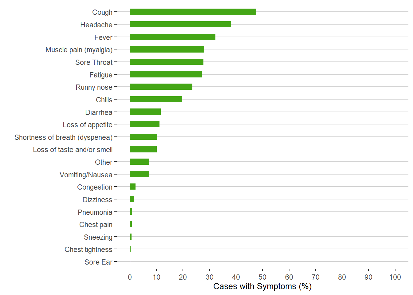 Figure 14. Percentage of Symptoms Reported by COVID-19 Cases, Manitoba, March 13, 2020 – December 4, 2021