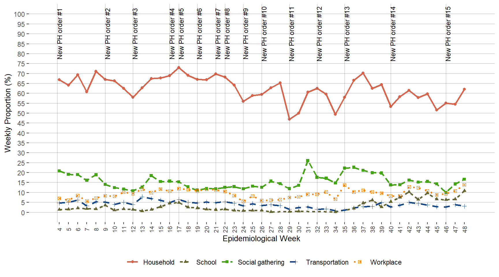 Figure 12. Percentage of Total COVID-19 Cases Exposed to Top-five Transmission Settings, Manitoba, January 24, 2021 – December 4, 2021