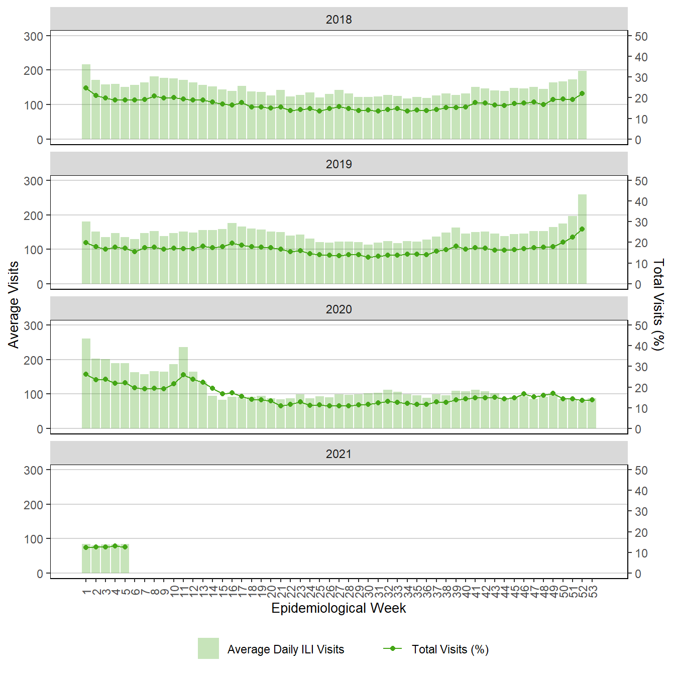 Figure 12. Weekly Respiratory Visits to Emergency Department, Winnipeg Regional Health Authority, Manitoba, 2018 – 2021