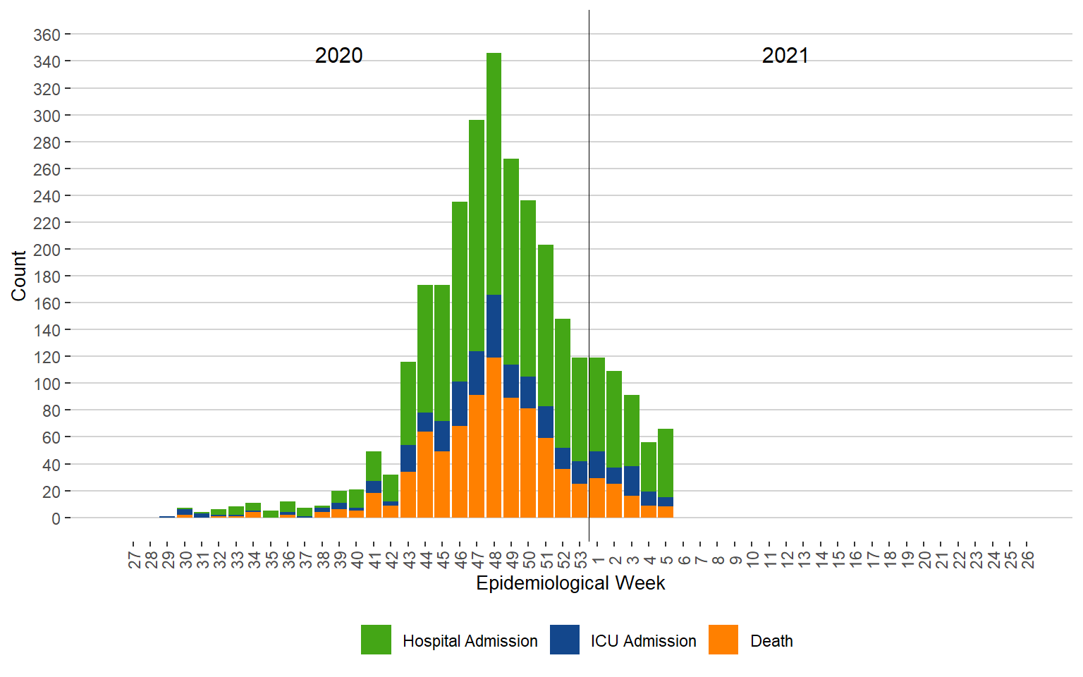 Figure 5. Severe Outcomes of COVID-19 by Week of Public Health Report Date, Manitoba, 2020 – 2021