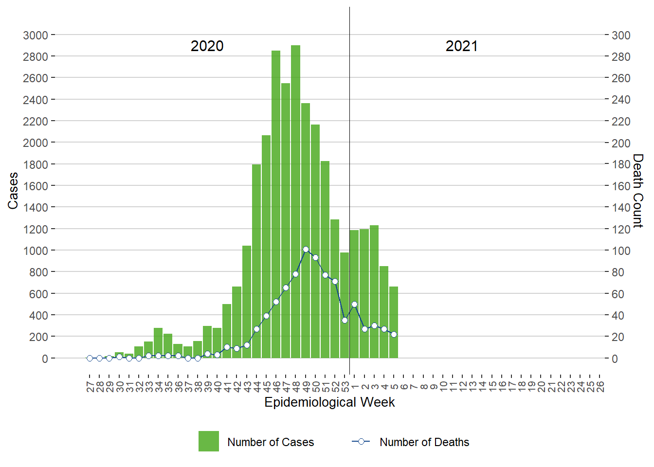 Figure 1. Cases of COVID-19 by Week of Public Health Report Date, Manitoba, 2020 – 2021