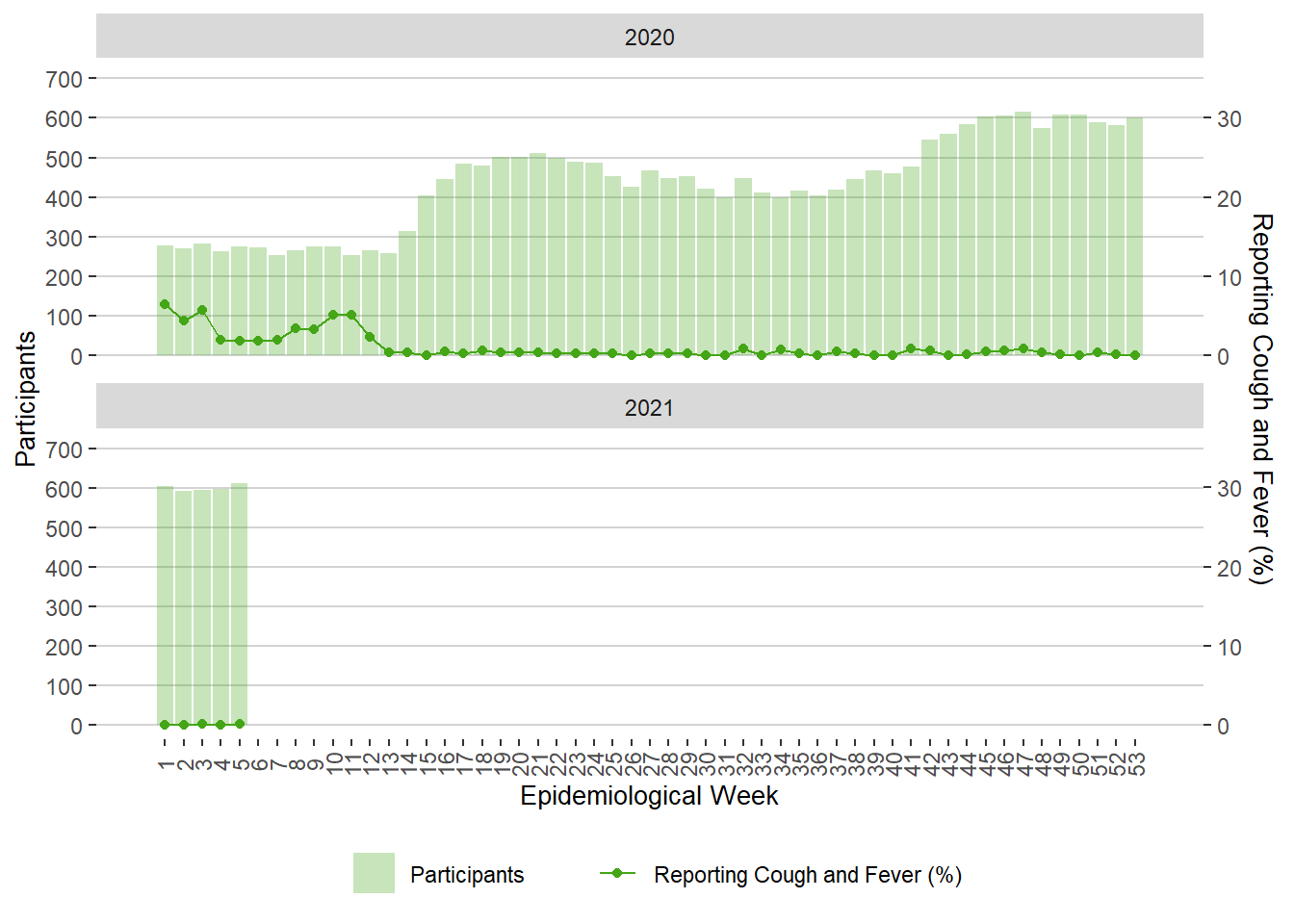 Figure 10. Weekly FluWatchers Participants and Percentage Reporting Fever and Cough, Manitoba, 2021