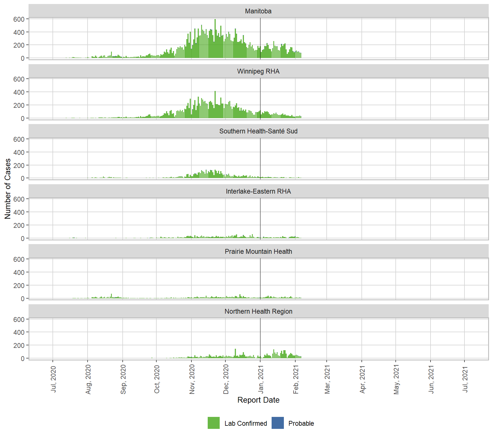 Figure 3. Cases of COVID-19 by Health Region and Public Health Report Date, Manitoba, 2020 – 2021