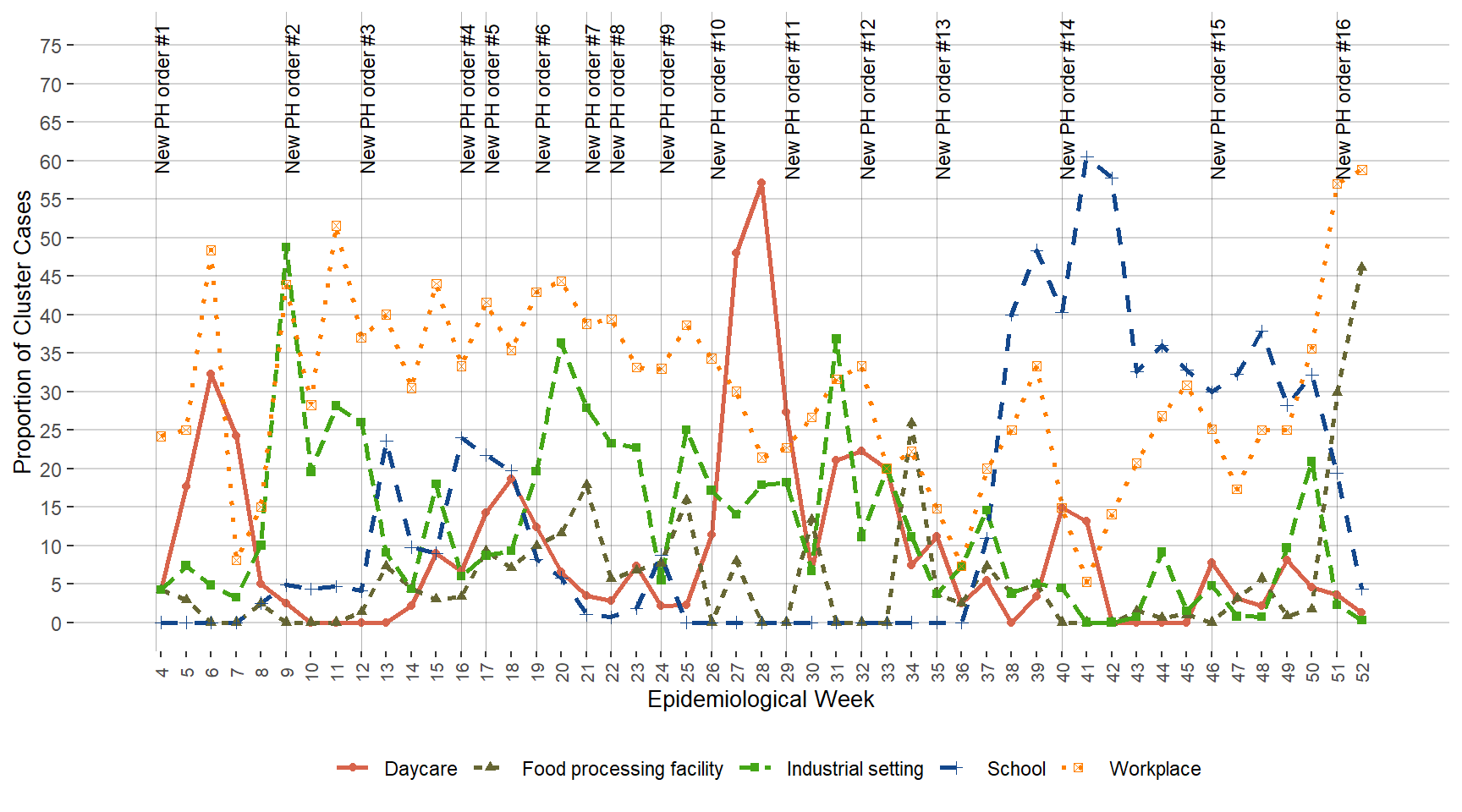 Figure 11. Percentage of COVID-19 Cases Linked to Top-five Cluster/Outbreak/Special Investigation Settings, Manitoba, January 24, 2021 – January 1, 2022