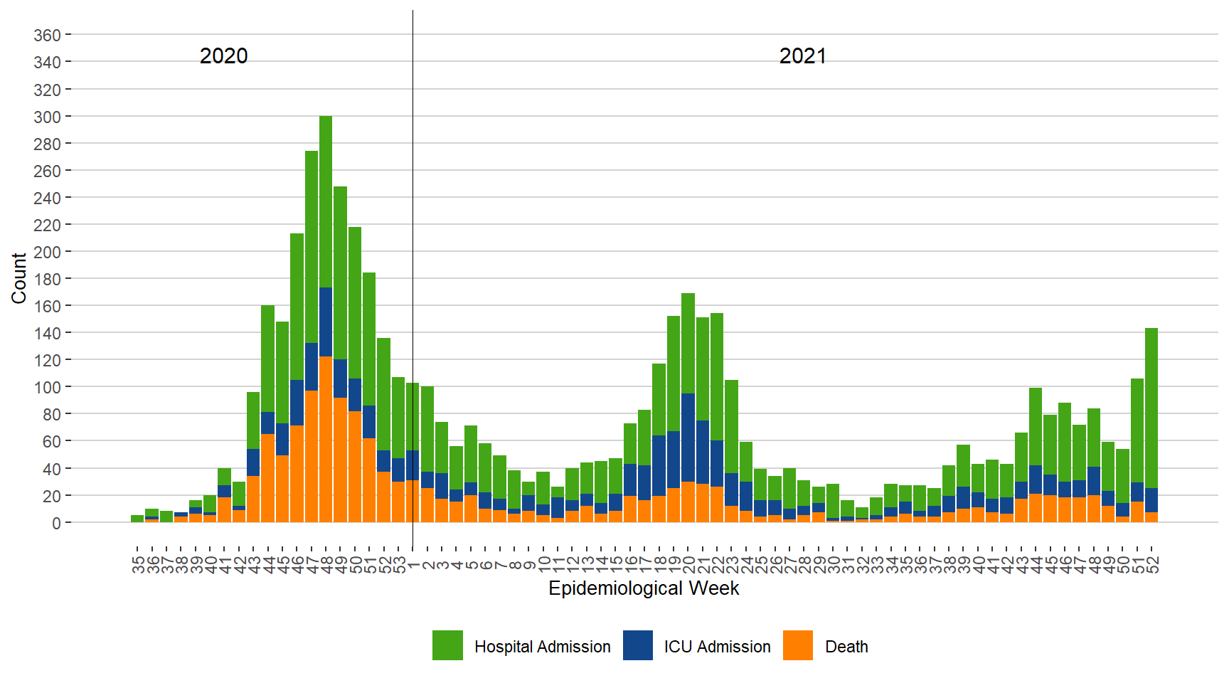 Figure 7. Severe Outcomes of COVID-19 by Week of Public Health Report Date, Manitoba, August 23, 2020 – January 1, 2022