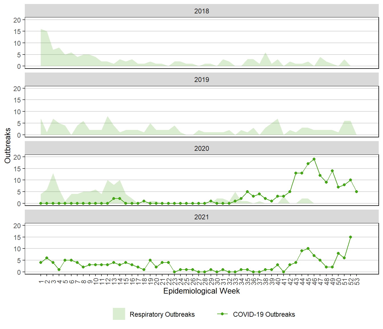 Figure 10. Weekly COVID-19 Outbreaks, Manitoba, 2018 – 2022