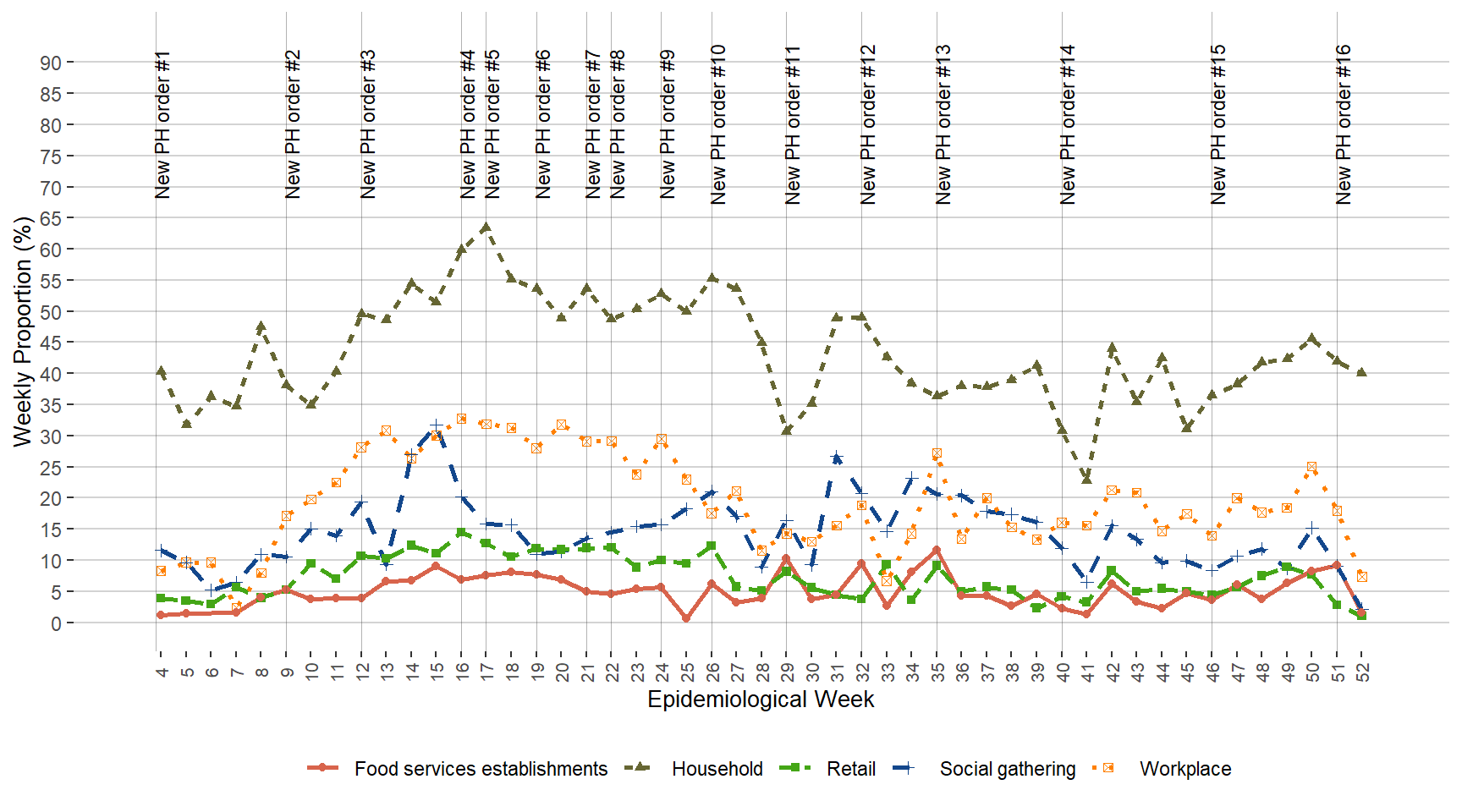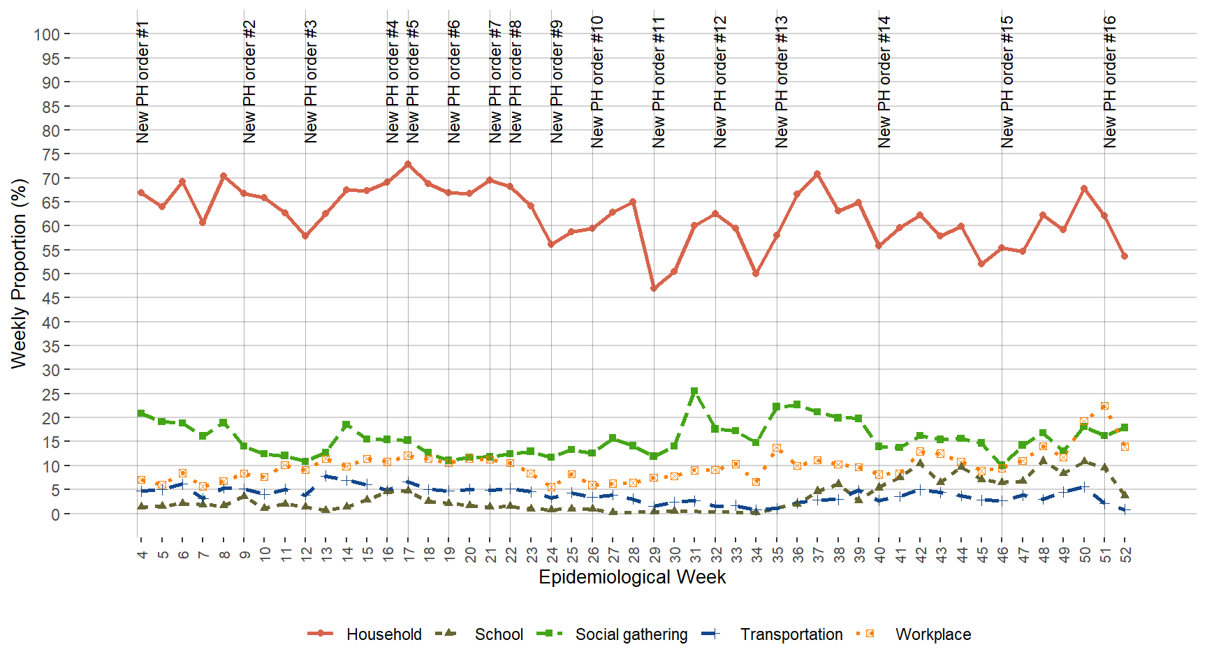 Figure 12. Percentage of Total COVID-19 Cases Exposed to Top-five Transmission Settings, Manitoba, January 24, 2021 – January 1, 2022