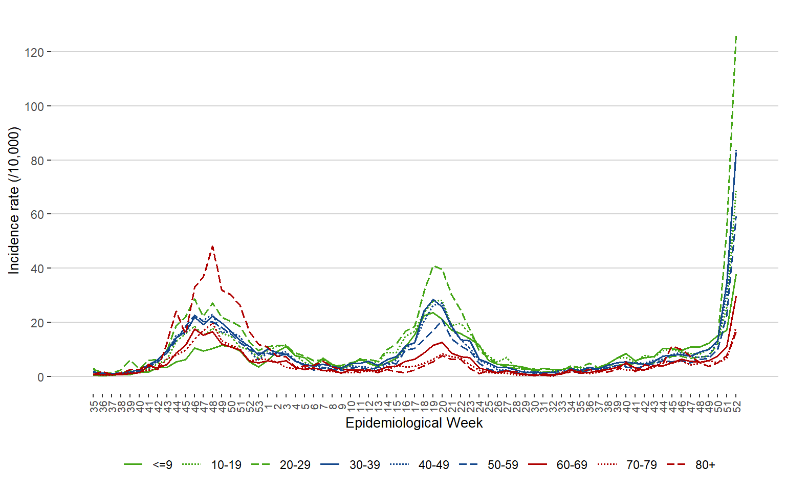 Back Figure 3. Incidence Rate (/10,000 Population) of COVID-19 Cases by Age Group and Week of Public Health Report Date, Manitoba, August 23, 2020 – January 1, 2022