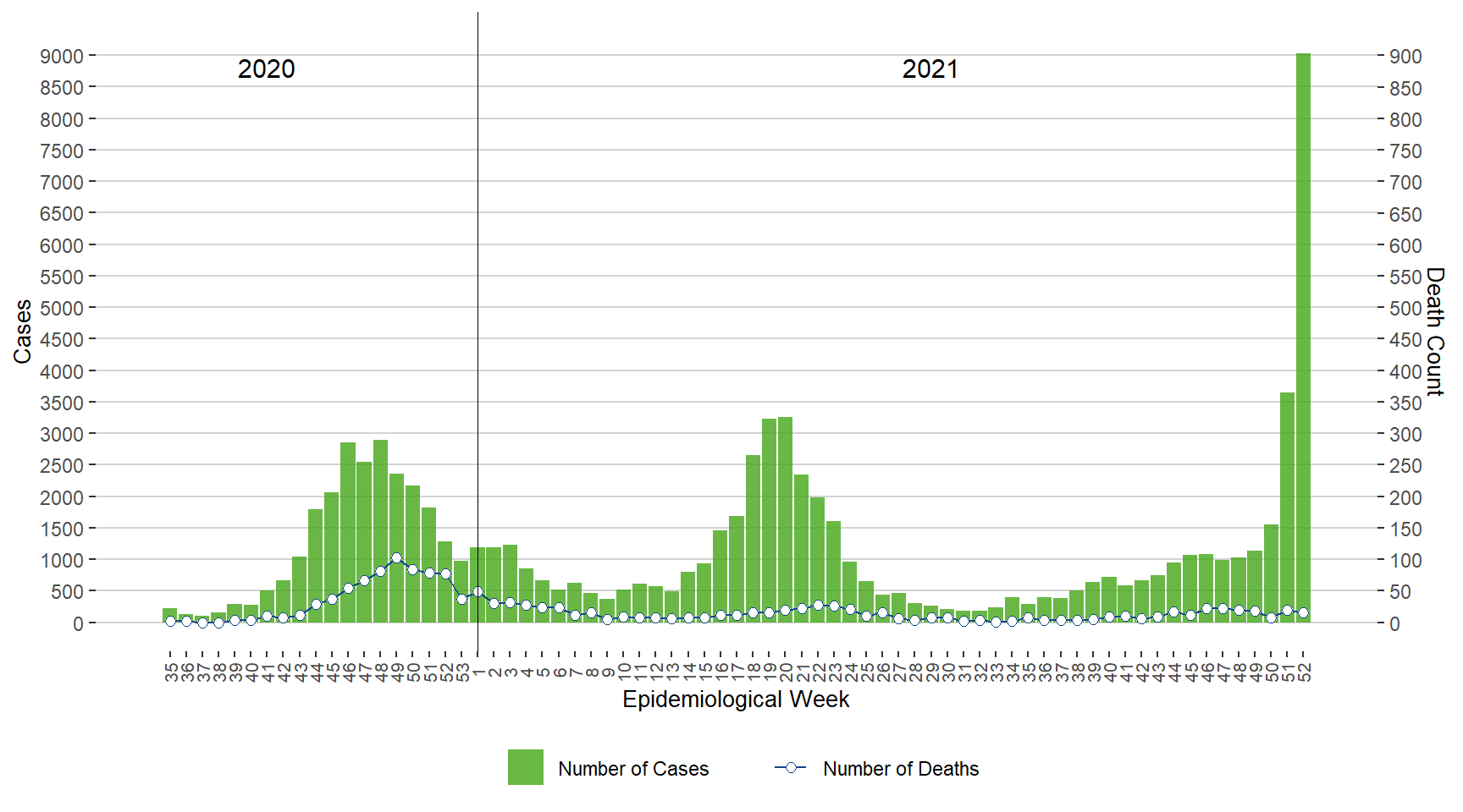 Figure 1. Cases of COVID-19 by Week of Public Health Report Date, Manitoba, August 23, 2020 – January 1, 2022