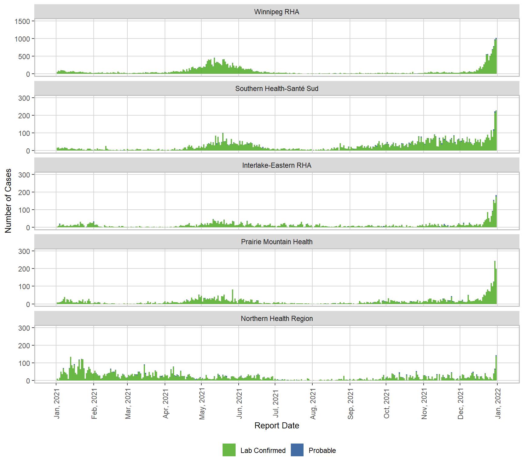 Back Figure 4. Cases of COVID-19 by Health Region and Public Health Report Date, Manitoba, January 1, 2021 – January 1, 2022