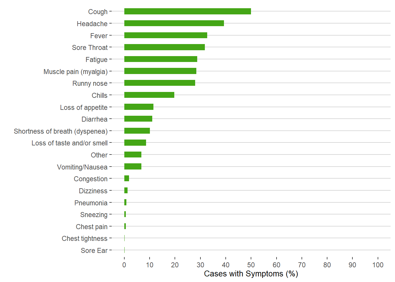 Figure 14. Percentage of Symptoms Reported by COVID-19 Cases, Manitoba, March 13, 2020 – January 1, 2022
