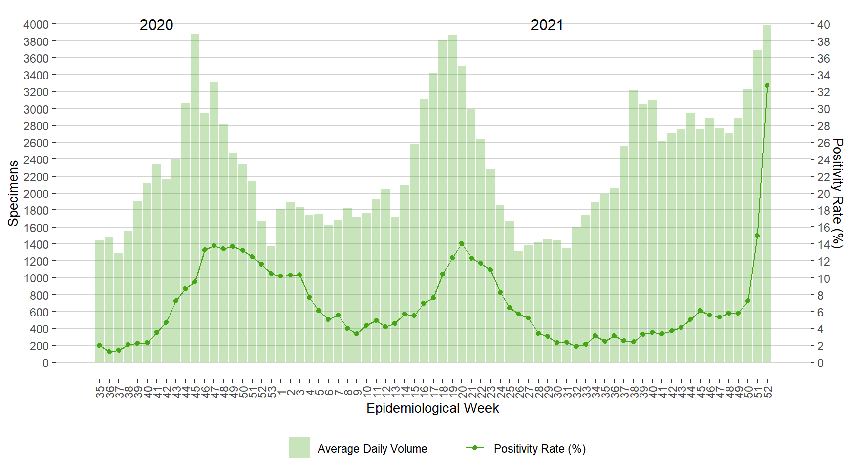 Figure 6. Average Daily Testing Volume and Positivity (%) for COVID-19 by Week of Specimen Receiving Date, Manitoba, August 23, 2020 – January 1, 2022