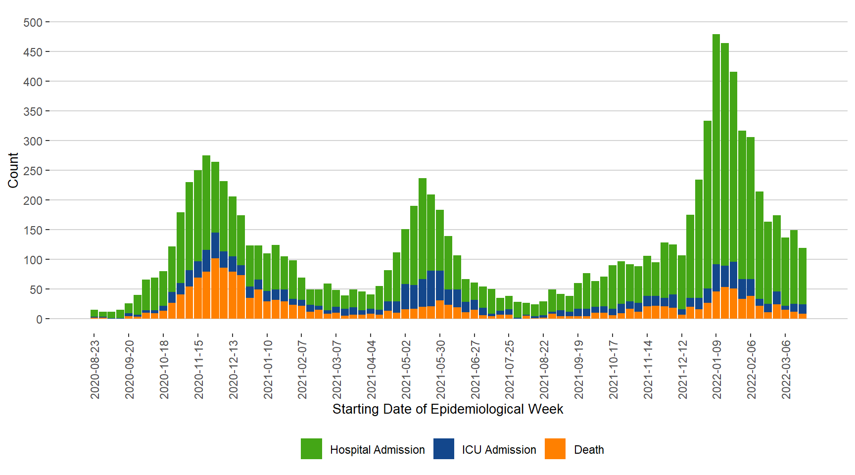 Figure 8. Severe Outcomes of COVID-19 by Week of Outcome Date, Manitoba, August 23, 2020 – March 26, 2022