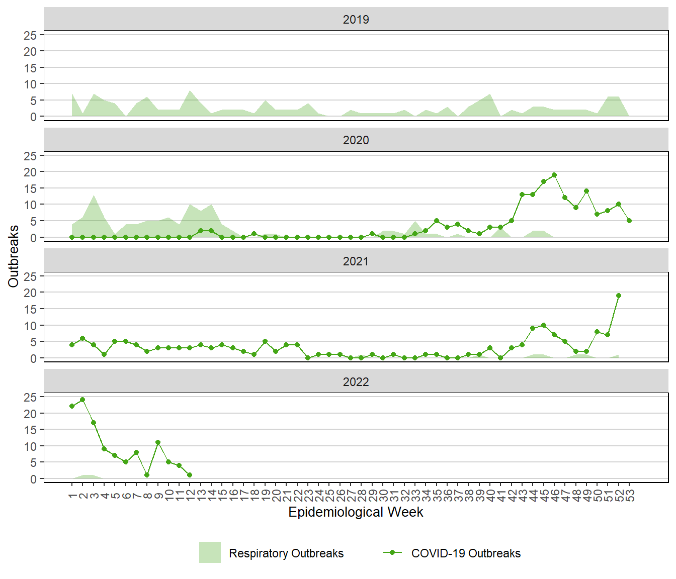 Figure 11. Weekly COVID-19 Outbreaks, Manitoba, 2018 – 2022