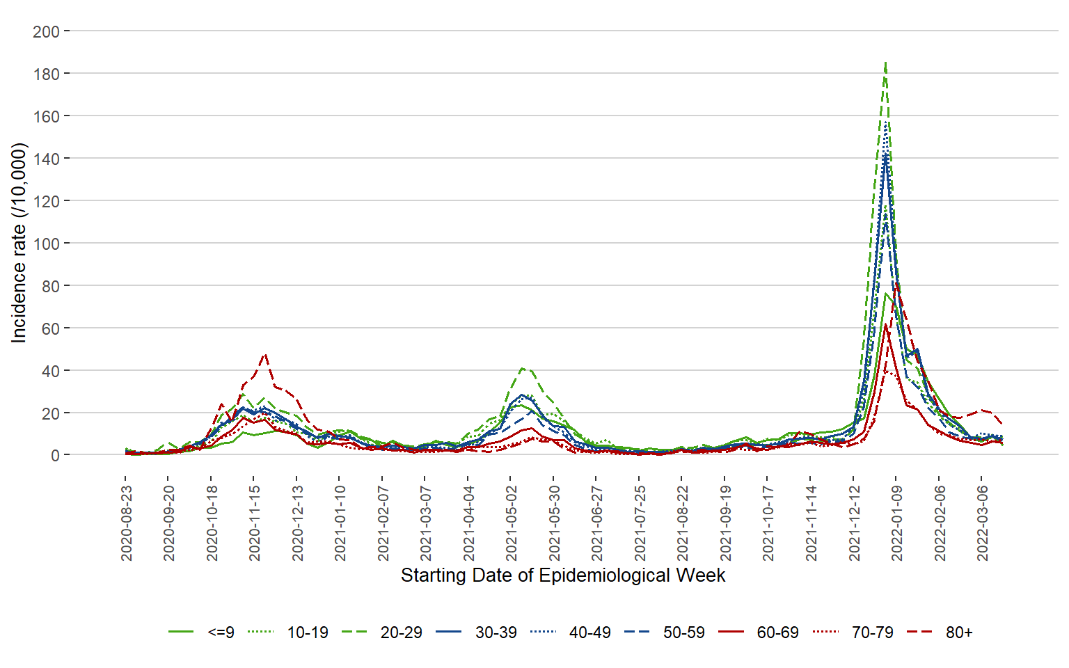 Figure 3. Incidence Rate (/10,000 Population) of COVID-19 Cases by Age Group and Week of Public Health Report Date, Manitoba, August 23, 2020 – March 26, 2022
