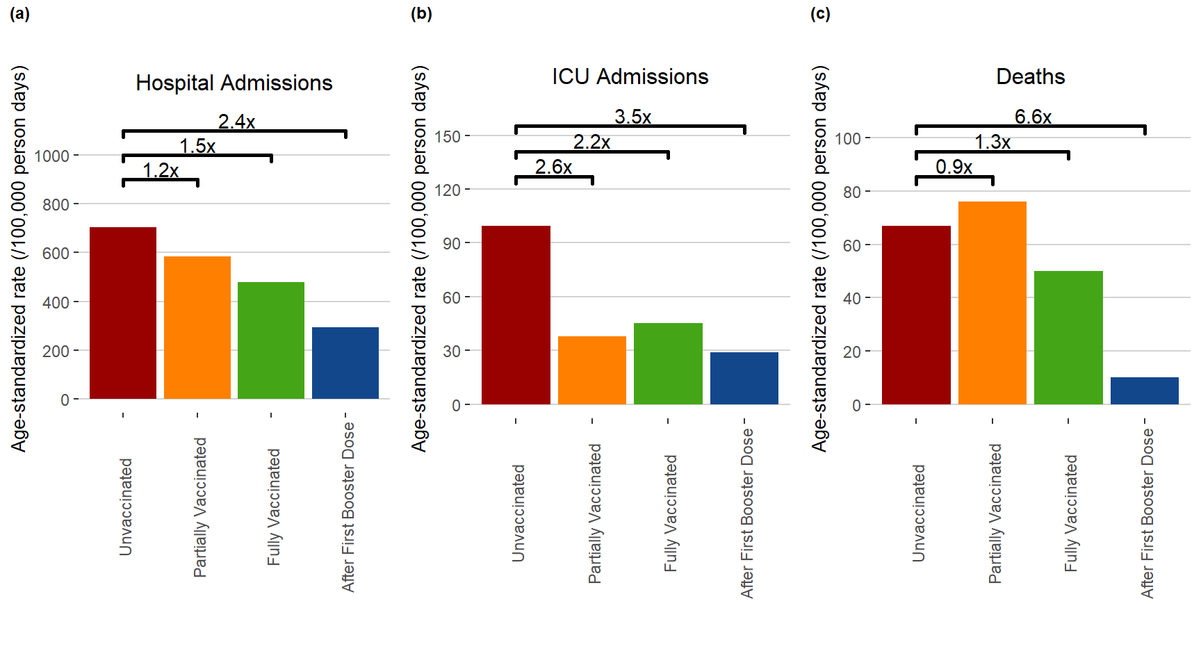 Unvaccinated Case: Individuals not vaccinated or vaccinated 0–13 days following the first dose of a COVID-19 vaccine. Partially Vaccinated Case: Individuals vaccinated >=14 days following the first dose of a 2-dose series COVID-19 vaccine if only one dose was received and 0-13 days following the second dose if two doses were received. Fully Vaccinated Case: Individuals vaccinated >=14 days following the second dose of a 2-dose series or first dose of a 1-dose series of a COVID-19 vaccine. After First Booster Dose: Individuals vaccinated >=14 days following one additional dose after completion of primary series.