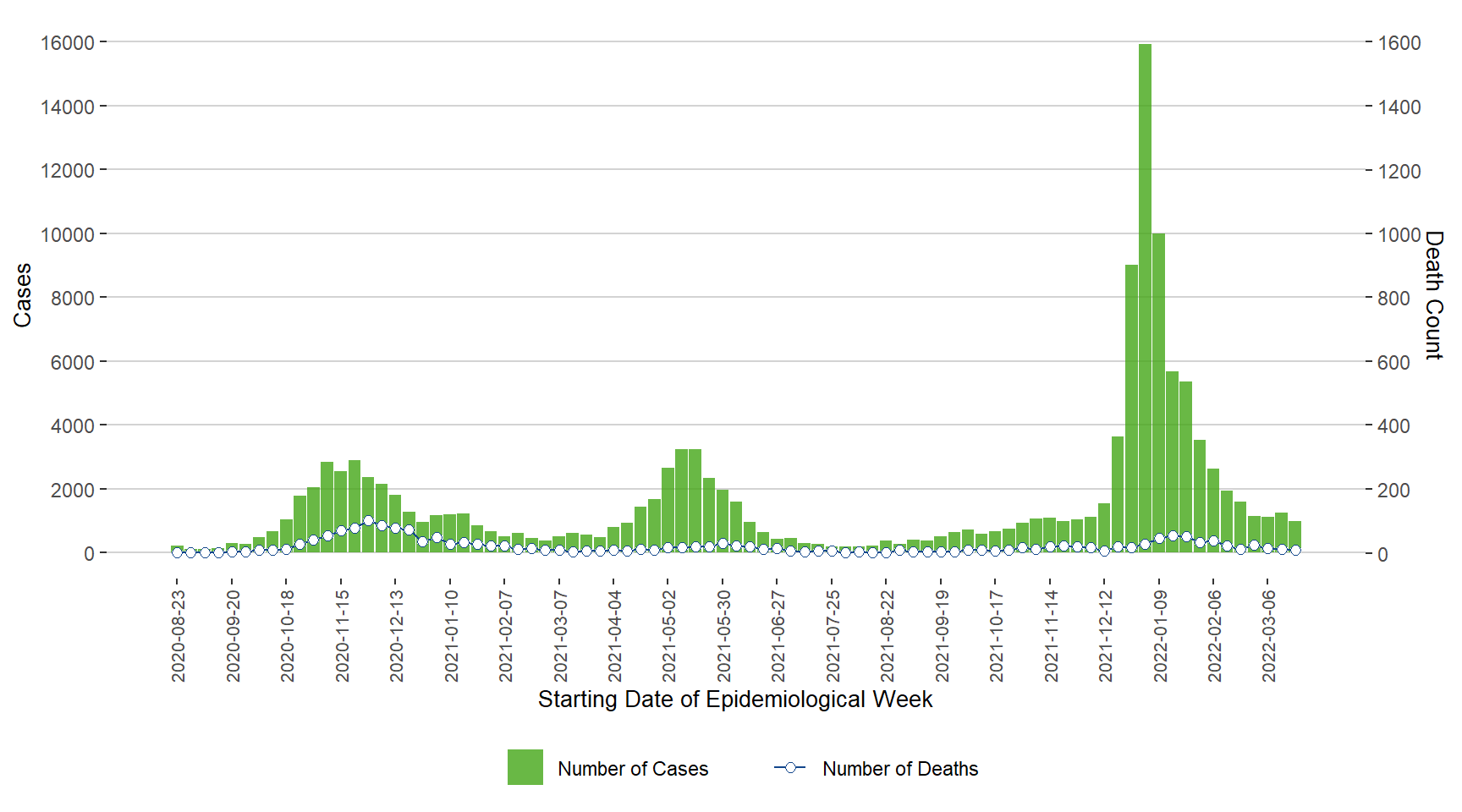 Figure 1. Cases of COVID-19 by Week of Public Health Report Date, Manitoba, August 23, 2020 – March 26, 2022