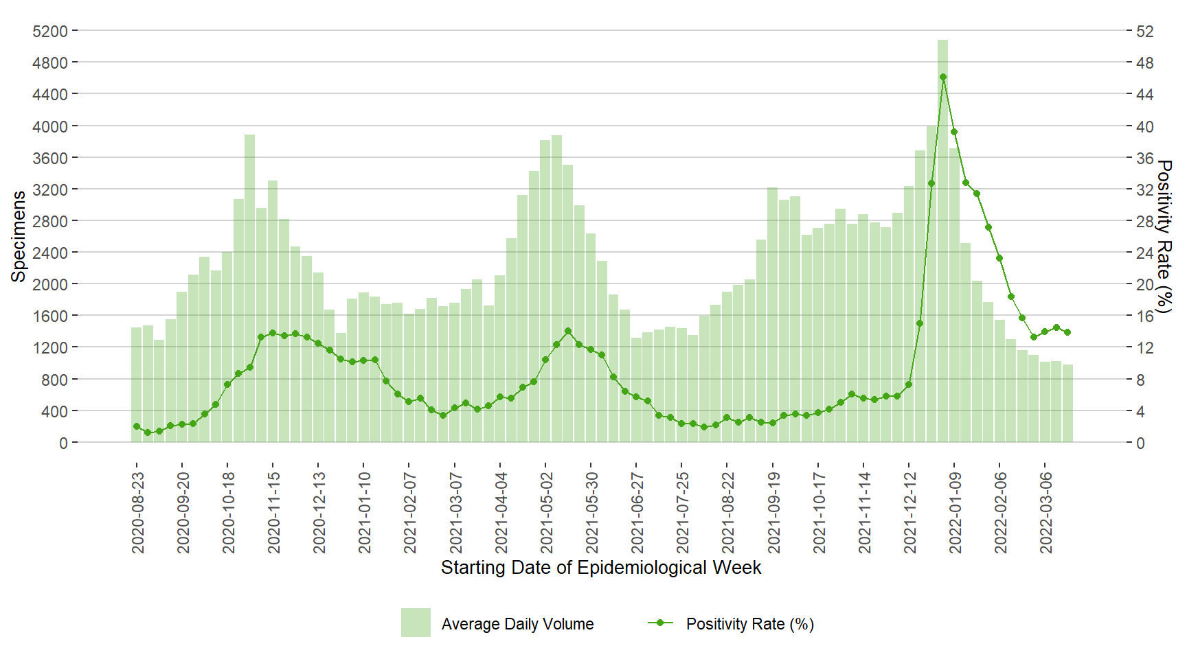 Figure 7. Average Daily Testing Volume and Positivity (%) for COVID-19 by Week of Specimen Receiving Date, Manitoba, August 23, 2020 – March 26, 2022