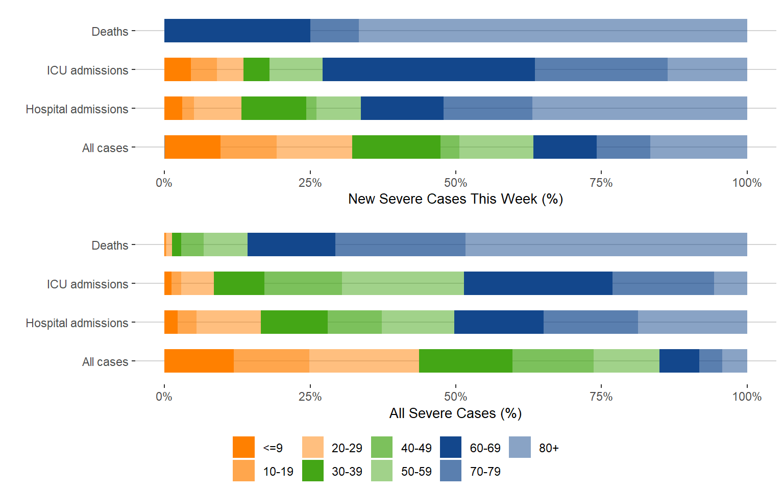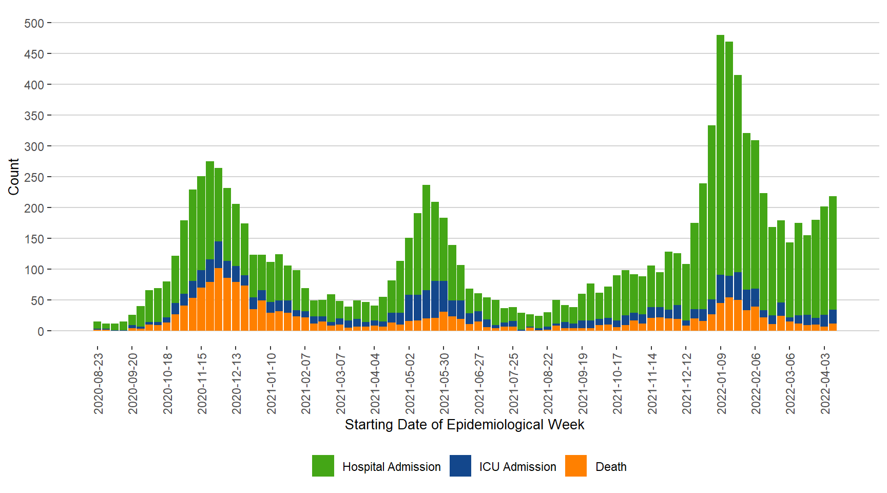Severe outcomes resulting from COVID-19 infection increased compared to previous weeks. There were 218 total severe outcomes, with 206 hospital admissions and 12 deaths. Of the 206 hospital admissions, 22 were ICU admissions.