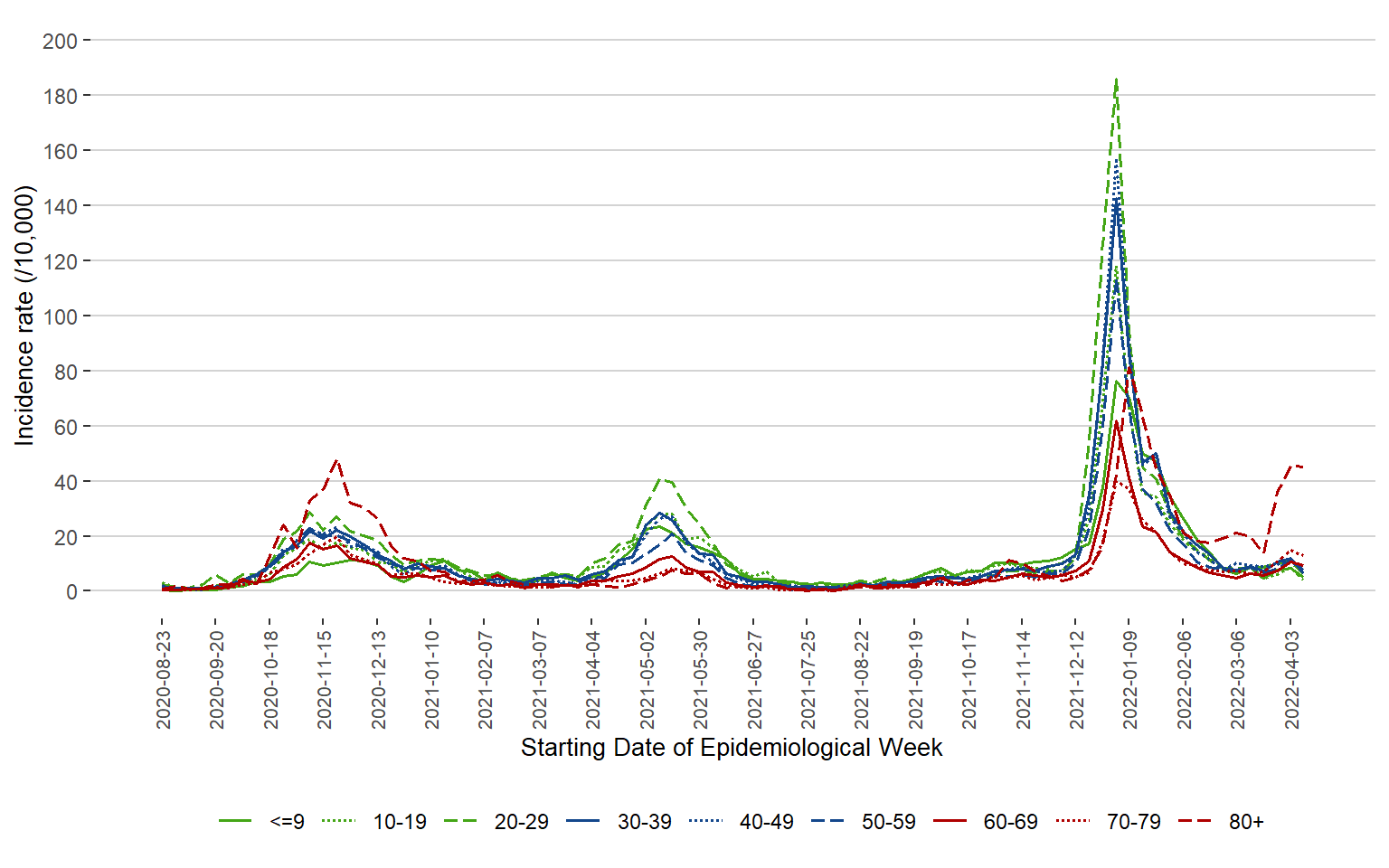 Figure 3. Incidence Rate (/10,000 Population) of COVID-19 Cases by Age Group and Week of Public Health Report Date, Manitoba, August 23, 2020 – April 16, 2022
