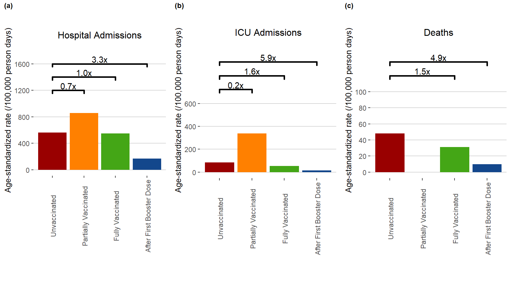 Unvaccinated Case: Individuals not vaccinated or vaccinated 0–13 days following the first dose of a COVID-19 vaccine. Partially Vaccinated Case: Individuals vaccinated >=14 days following the first dose of a 2-dose series COVID-19 vaccine if only one dose was received and 0-13 days following the second dose if two doses were received. Fully Vaccinated Case: Individuals vaccinated >=14 days following the second dose of a 2-dose series or first dose of a 1-dose series of a COVID-19 vaccine. After First Booster Dose: Individuals vaccinated >=14 days following one additional dose after completion of primary series.