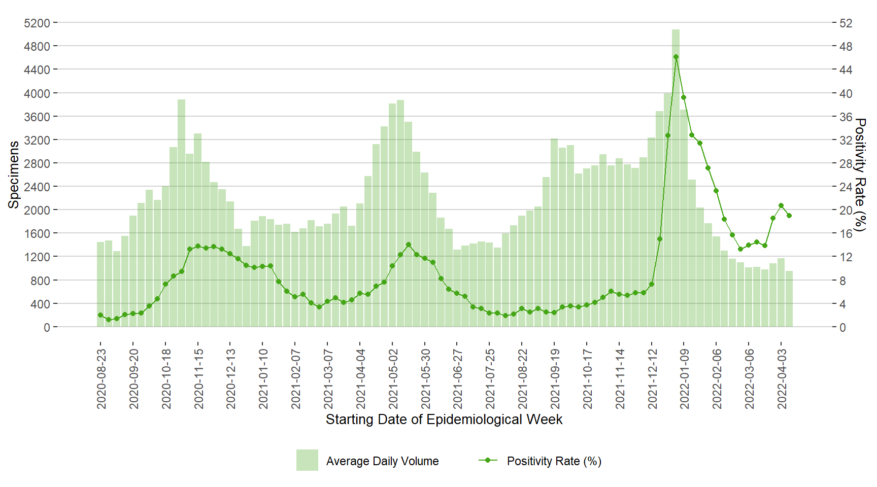 Figure 7. Average Daily Testing Volume and Positivity (%) for COVID-19 by Week of Specimen Receiving Date, Manitoba, August 23, 2020 – April 16, 2022