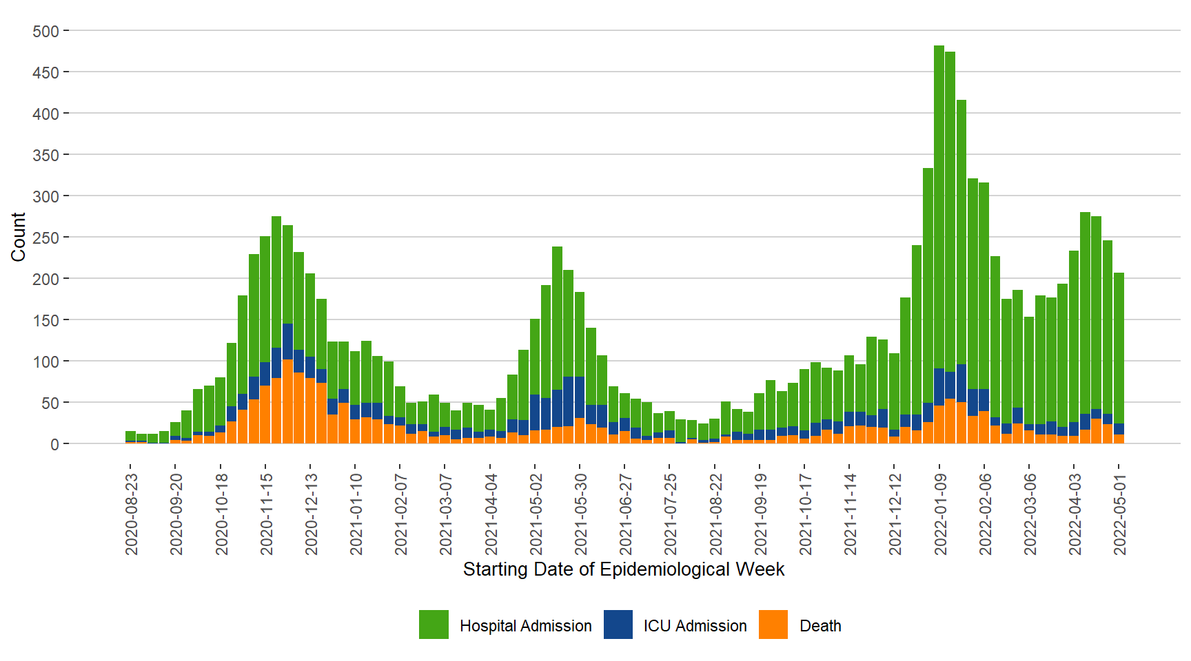 Figure 8. Severe Outcomes of COVID-19 by Week of Outcome Date, Manitoba, August 23, 2020 – May 7, 2022
