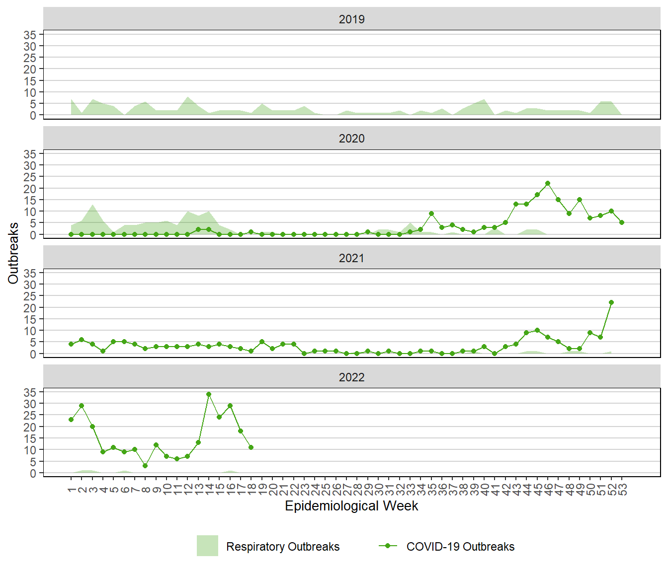 Figure 11. Weekly COVID-19 Outbreaks, Manitoba, 2018 – 2022