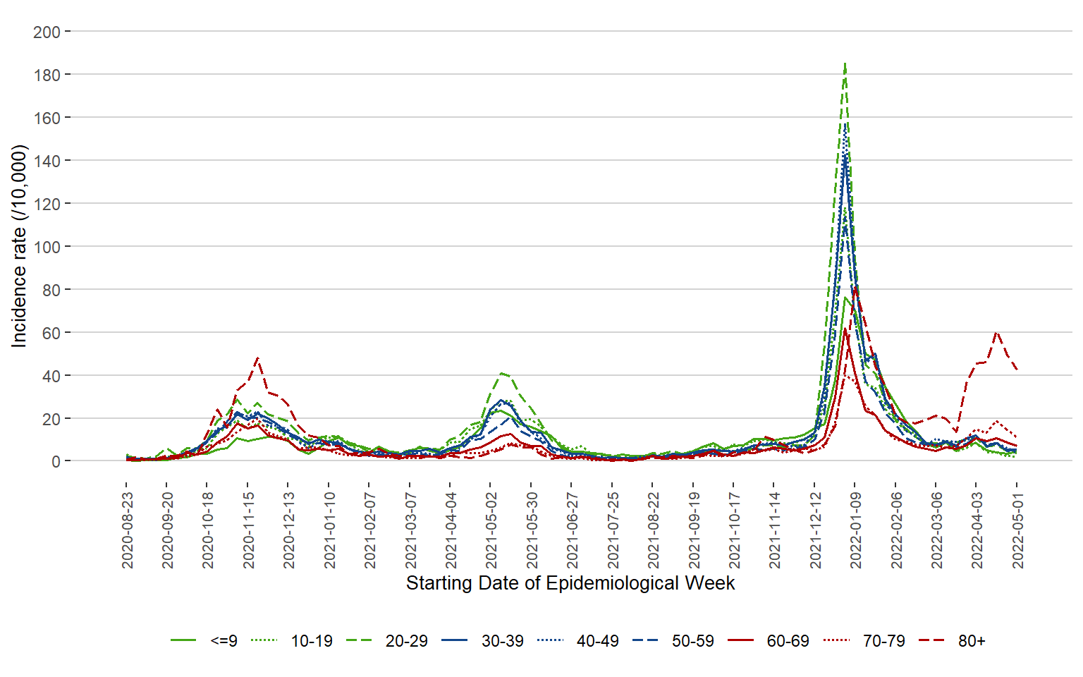 Figure 3. Incidence Rate (/10,000 Population) of COVID-19 Cases by Age Group and Week of Public Health Report Date, Manitoba, August 23, 2020 – May 7, 2022