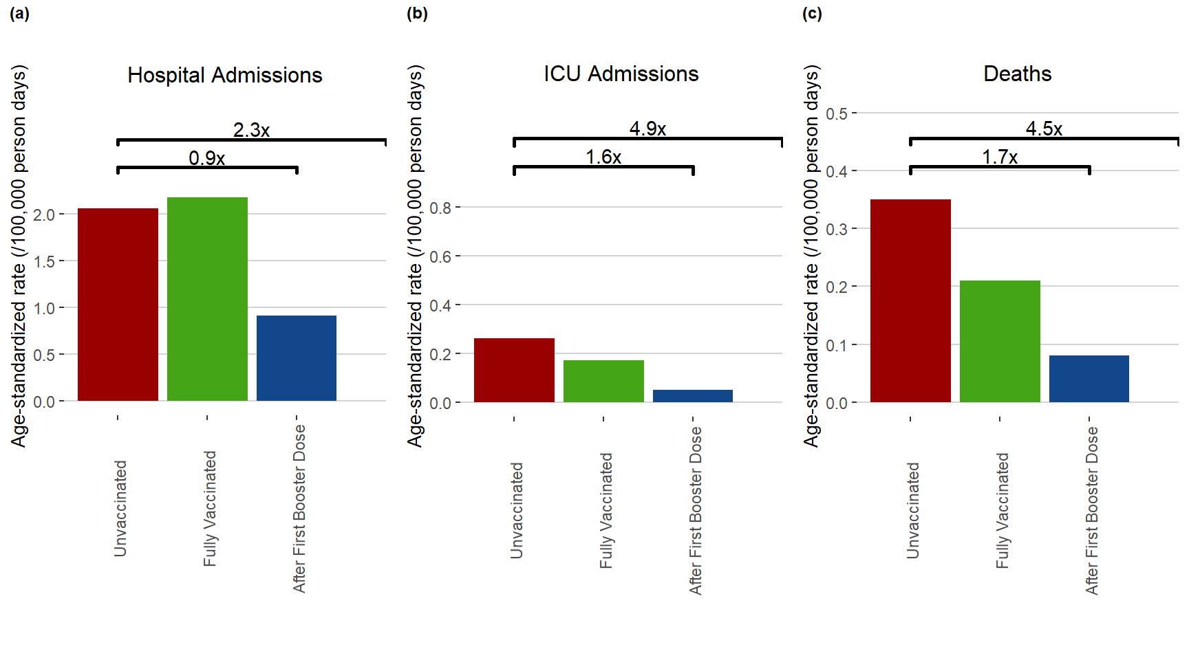 Figure 6. Age-Standardized Rate (/100,000 person days) and Risk of Severe Outcomes Associated with COVID-19 Manitoba, March 1, 2022 – March 31, 2022