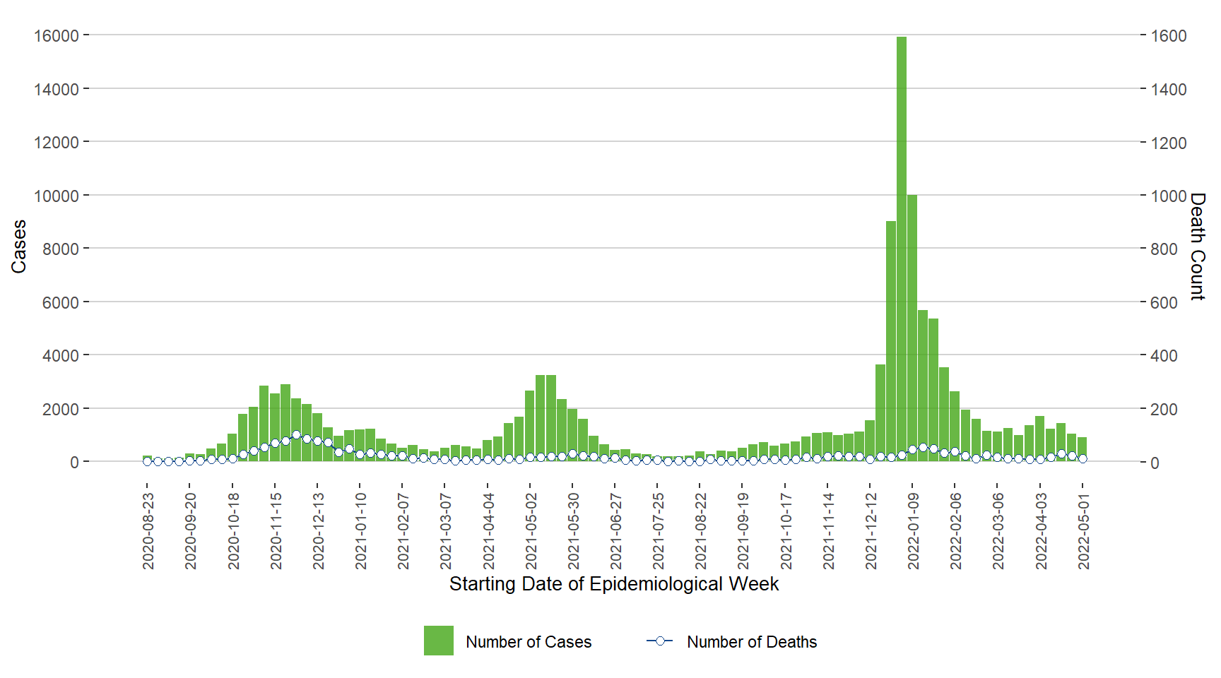 Figure 1. Cases of COVID-19 by Week of Public Health Report Date, Manitoba, August 23, 2020 – May 7, 2022