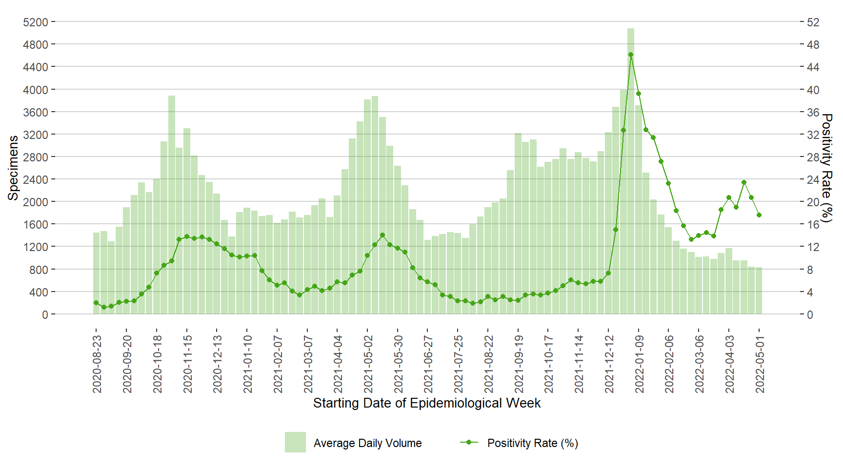 Figure 7. Average Daily Testing Volume and Positivity (%) for COVID-19 by Week of Specimen Receiving Date, Manitoba, August 23, 2020 – May 7, 2022