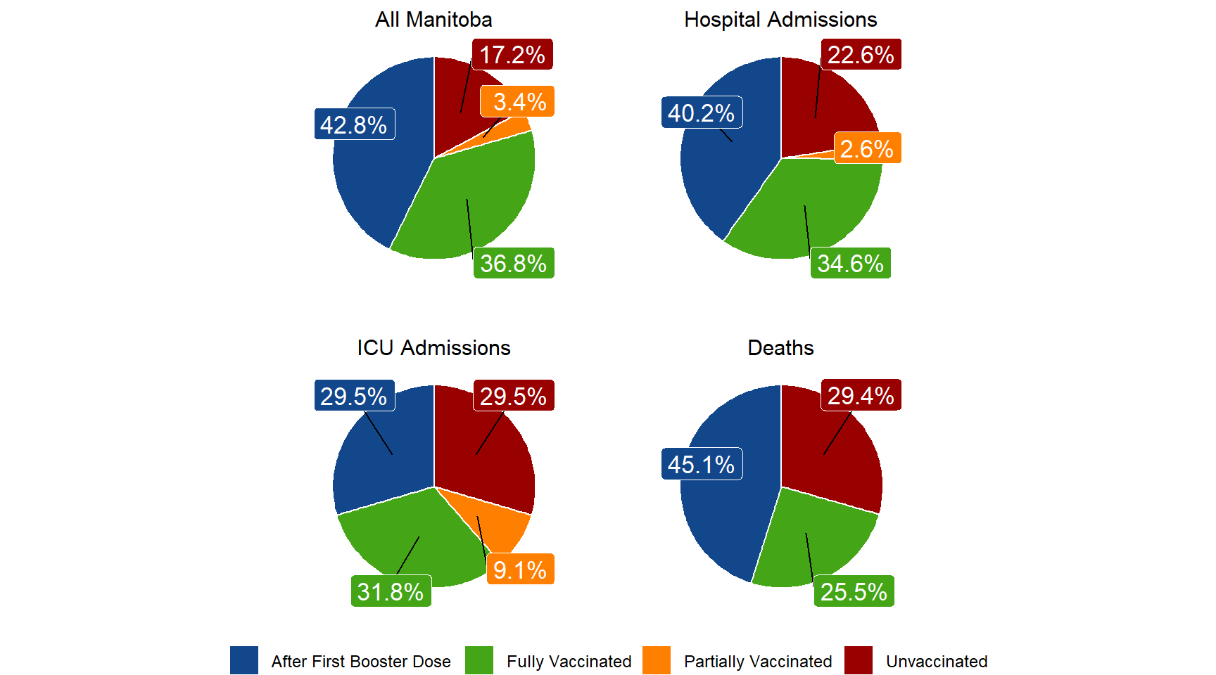In all Manitoba residents, 83.0% of residents have been partially vaccinated and 79.6% have been fully vaccinated. By April 30th, 42.8% have received one additional dose.