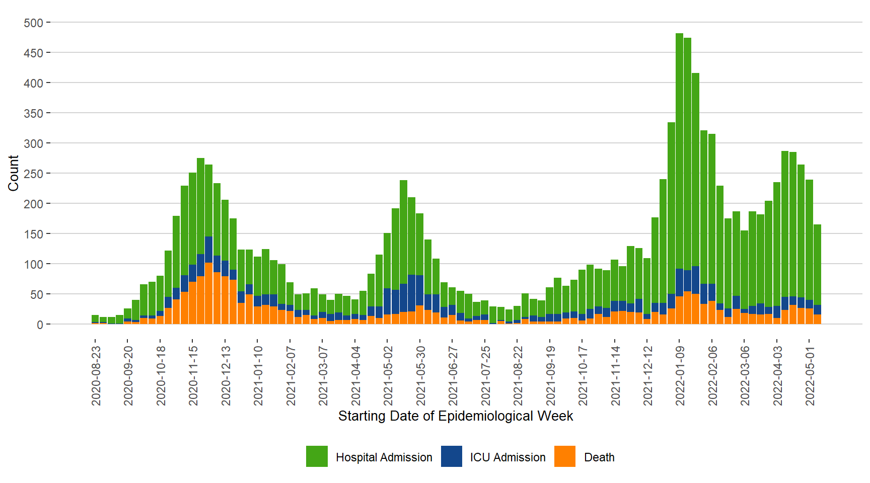 Figure 8. Severe Outcomes of COVID-19 by Week of Outcome Date, Manitoba, August 23, 2020 – May 14, 2022