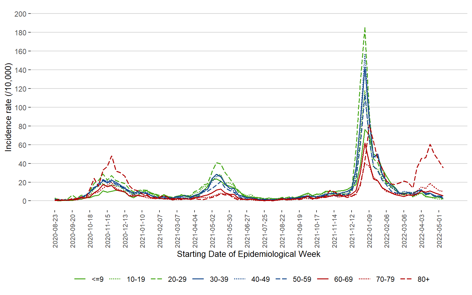 Figure 3. Incidence Rate (/10,000 Population) of COVID-19 Cases by Age Group and Week of Public Health Report Date, Manitoba, August 23, 2020 – May 14, 2022
