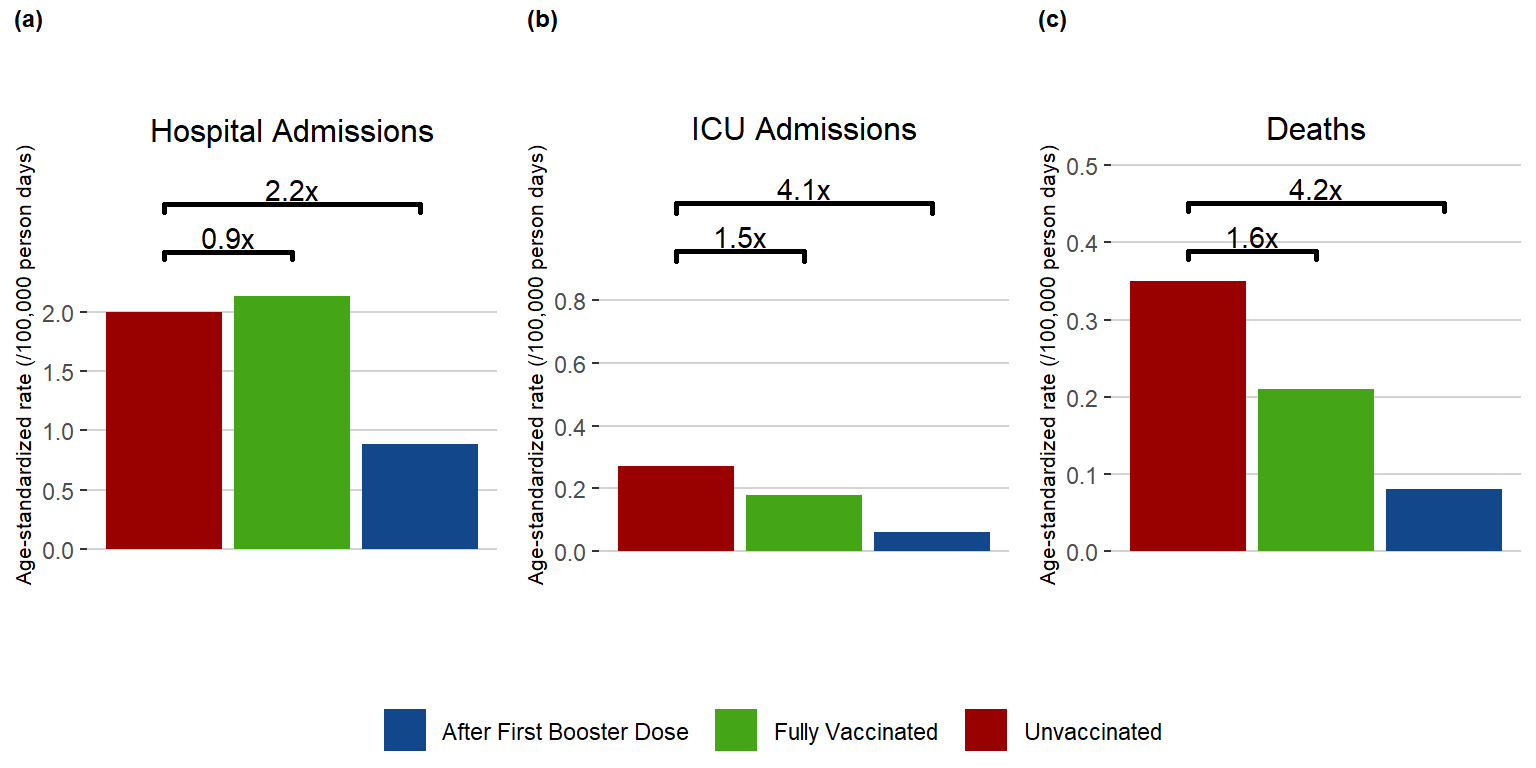 Figure 6. Age-Standardized Rate (/100,000 person days) and Risk of Severe Outcomes Associated with COVID-19 Manitoba, March 1, 2022 – March 31, 2022