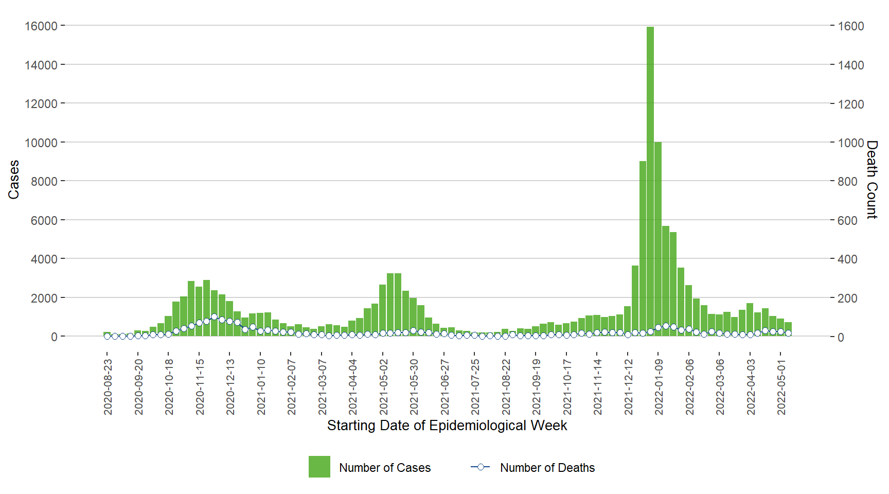 Figure 1. Cases of COVID-19 by Week of Public Health Report Date, Manitoba, August 23, 2020 – May 14, 2022