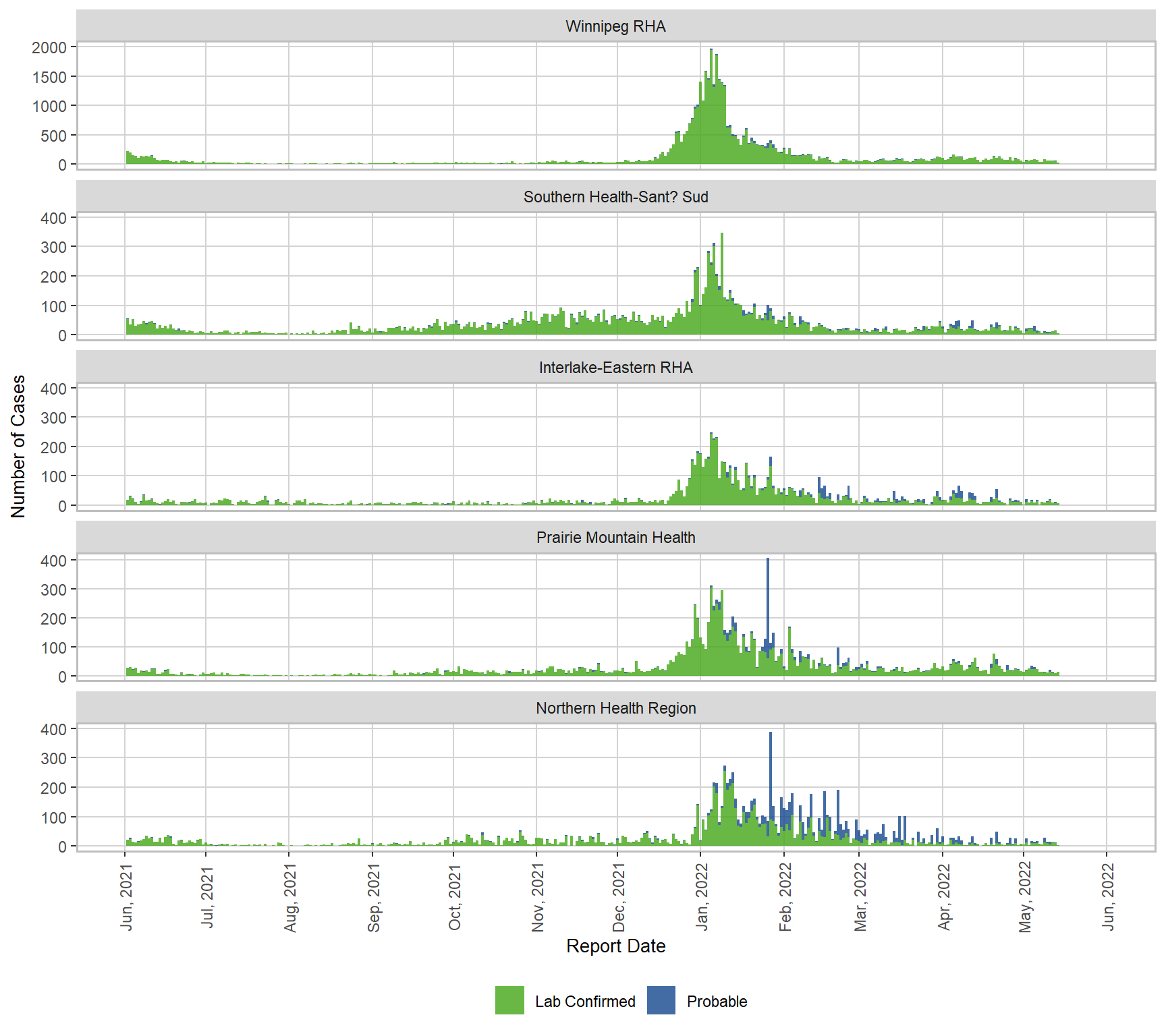 Figure 4. Cases of COVID-19 by Health Region and Public Health Report Date, Manitoba, June 1, 2021 – May 14, 2022