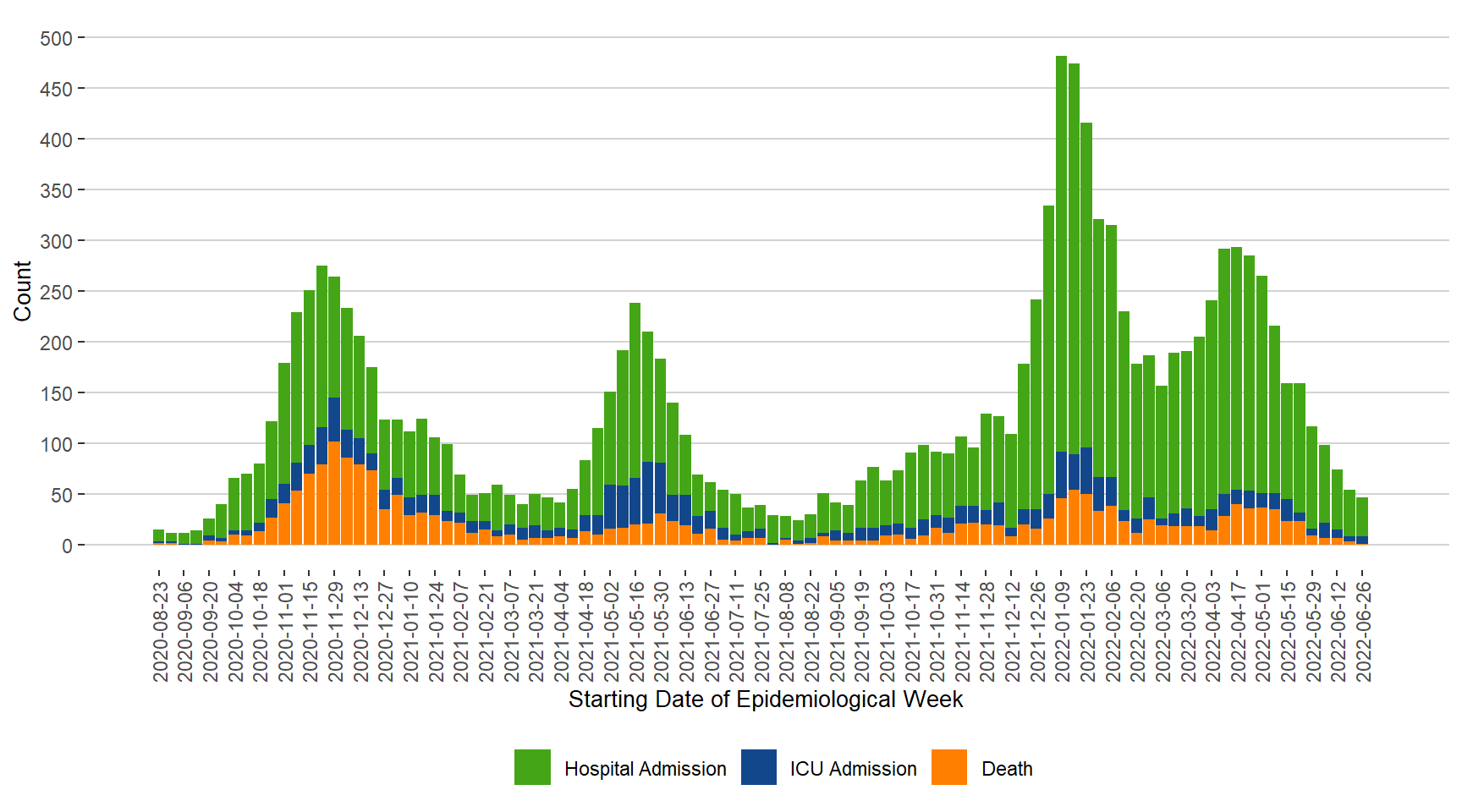 Figure 8. Severe Outcomes of COVID-19 by Week of Outcome Date, Manitoba, August 23, 2020 – July 2, 2022