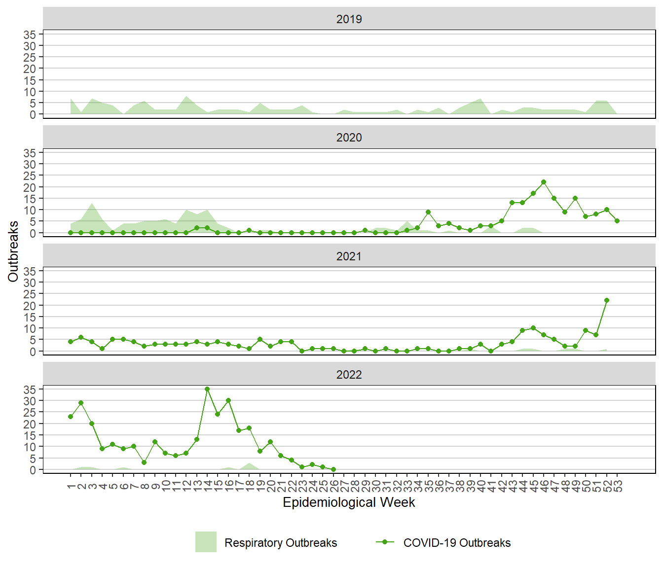 Figure 11. Weekly COVID-19 Outbreaks, Manitoba, 2019 – 2022