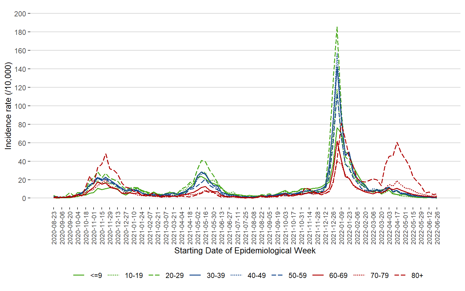 Figure 3. Incidence Rate (/10,000 Population) of COVID-19 Cases by Age Group and Week of Public Health Report Date, Manitoba, August 23, 2020 – July 2, 2022