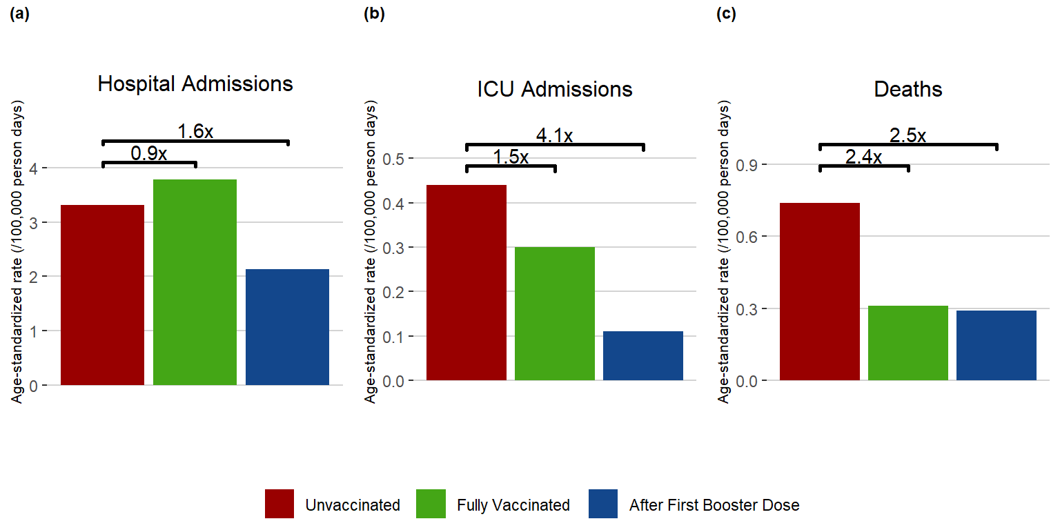 Figure 6. Age-Standardized Rate (/100,000 person days) and Risk of Severe Outcomes Associated with COVID-19 Manitoba, April 1, 2022 – April 30, 2022