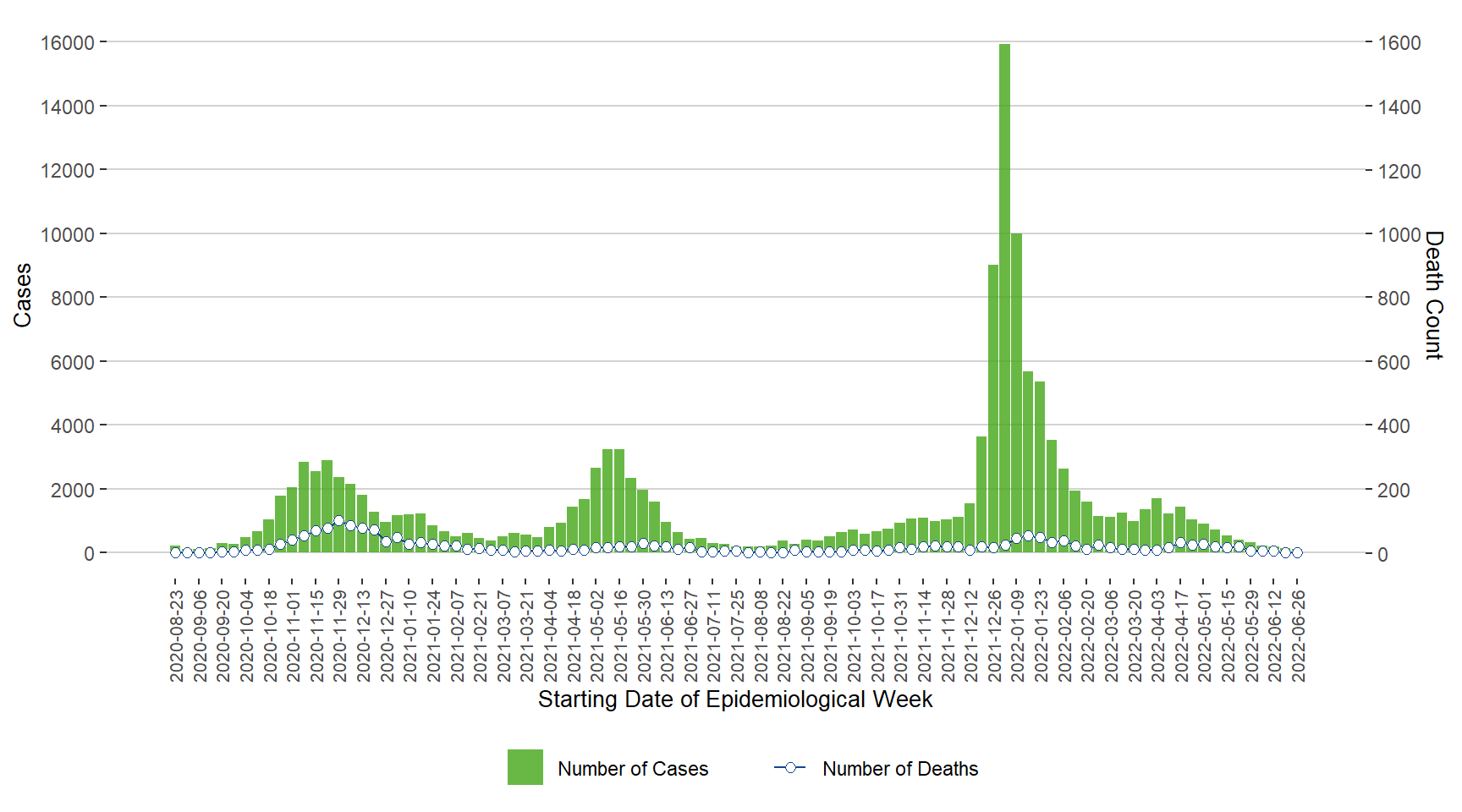 Figure 1. Cases of COVID-19 by Week of Public Health Report Date, Manitoba, August 23, 2020 – July 2, 2022