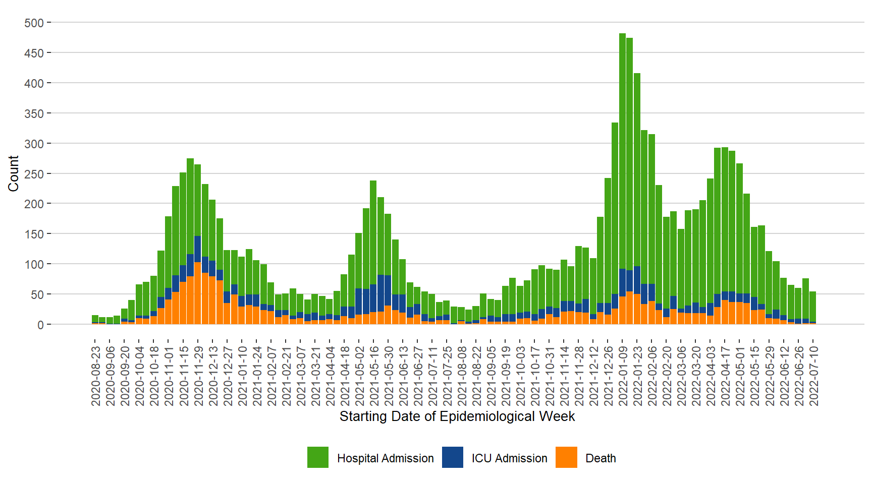 Figure 8. Severe Outcomes of COVID-19 by Week of Outcome Date, Manitoba, August 23, 2020 – July 16, 2022