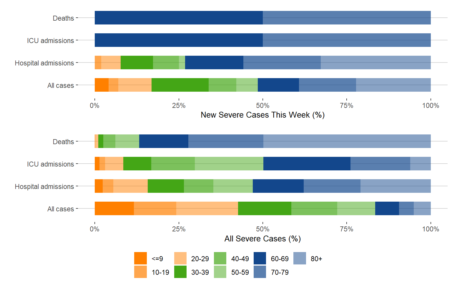 Figure 9. Age Distribution of Severe COVID-19 Cases Compared to All Cases, Manitoba, March 13, 2020 – July 16, 2022